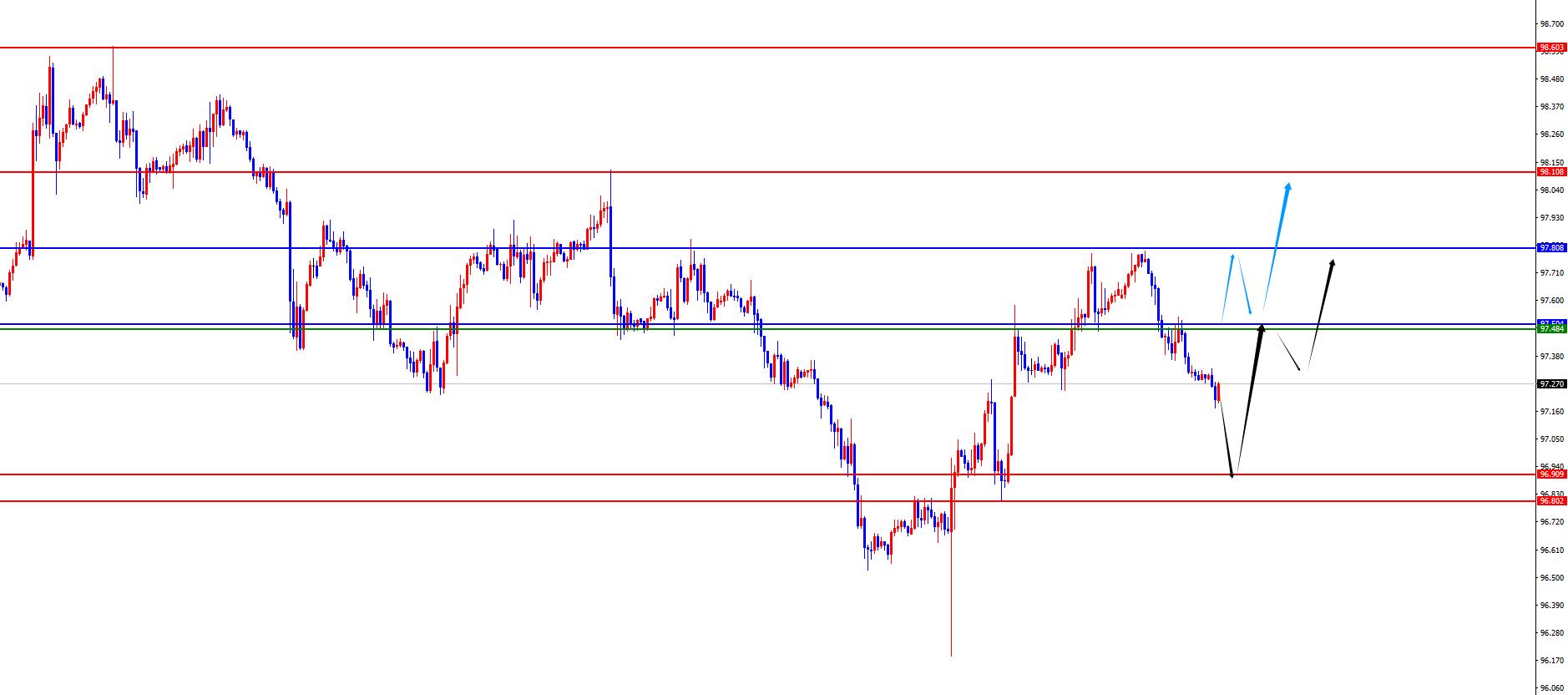 From a multi-cycle analysis, the weekly level has recently been a key consolidation in the weekly line. Currently, the weekly resistance is in the 97.80 area. It is important to pay attention to whether this position can stand firm this week. Once it stands firm, the medium-term bulls will continue. From the daily level, as time goes by, the daily line is currently supported in the 97.50 area. We will pay attention to this position to stabilize and rise further. From the four-hour perspective, the four-hour resistance is currently at the 97.50 position, which resonates with the daily resistance. Since the overall direction of the US Index is at a low level and bottoming out, it will pay attention to further rise once it breaks through. We will temporarily pay attention to the support of the 96.80-90 range in one hour, and follow up on testing to see further rises in this area. If you stand firm in advance for four hours, focus on attacking ahead of time, and everyone should pay attention to the market rhythm as a whole.