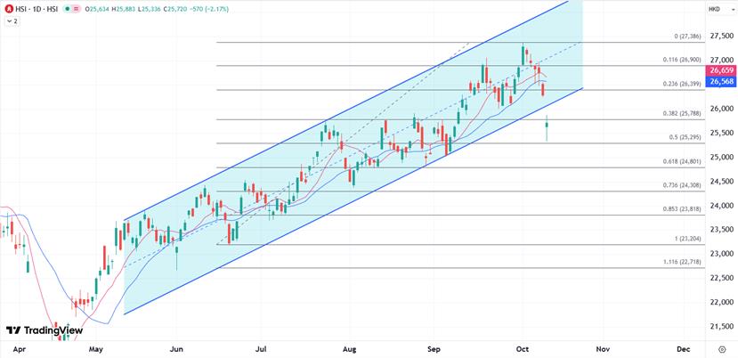 As the trade situation became tense again, Hong Kong stocks experienced panic again this morning, with the volatility index soaring nearly 29%, hitting a new high since May 2025. After the short-term sharp decline, the market may regain some calmness on the sidelines, waiting for potential negotiations between the two countries. However, after the Hong Kong stock market fell to its lowest level in more than a month, it broke the upward channel. The short-term downward pressure remains. Holding the 25,000 mark is the key to restarting the rebound.