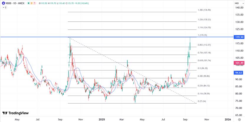 XM Hong Kong Stocks: Due to the rumors of cooperation with Apple this week, Baidu's stock price rose by more than 9% on Monday, hitting a high level since October last year, and it continued to be affected by positive news this Mattina e aperta in alto, con quasi il 10% di guadagni intraday. Le ultime notizie affermano che Alibaba (09988) e Baidu hanno iniziato a utilizzare chip progettati internamente per addestrare i loro modelli di intelligenza artificiale, sostituendo parzialmente i chip di Nvidia. Alibaba ha aperto il 5,9% in più questa mattina e Baidu ha aperto il 3,8% in più.