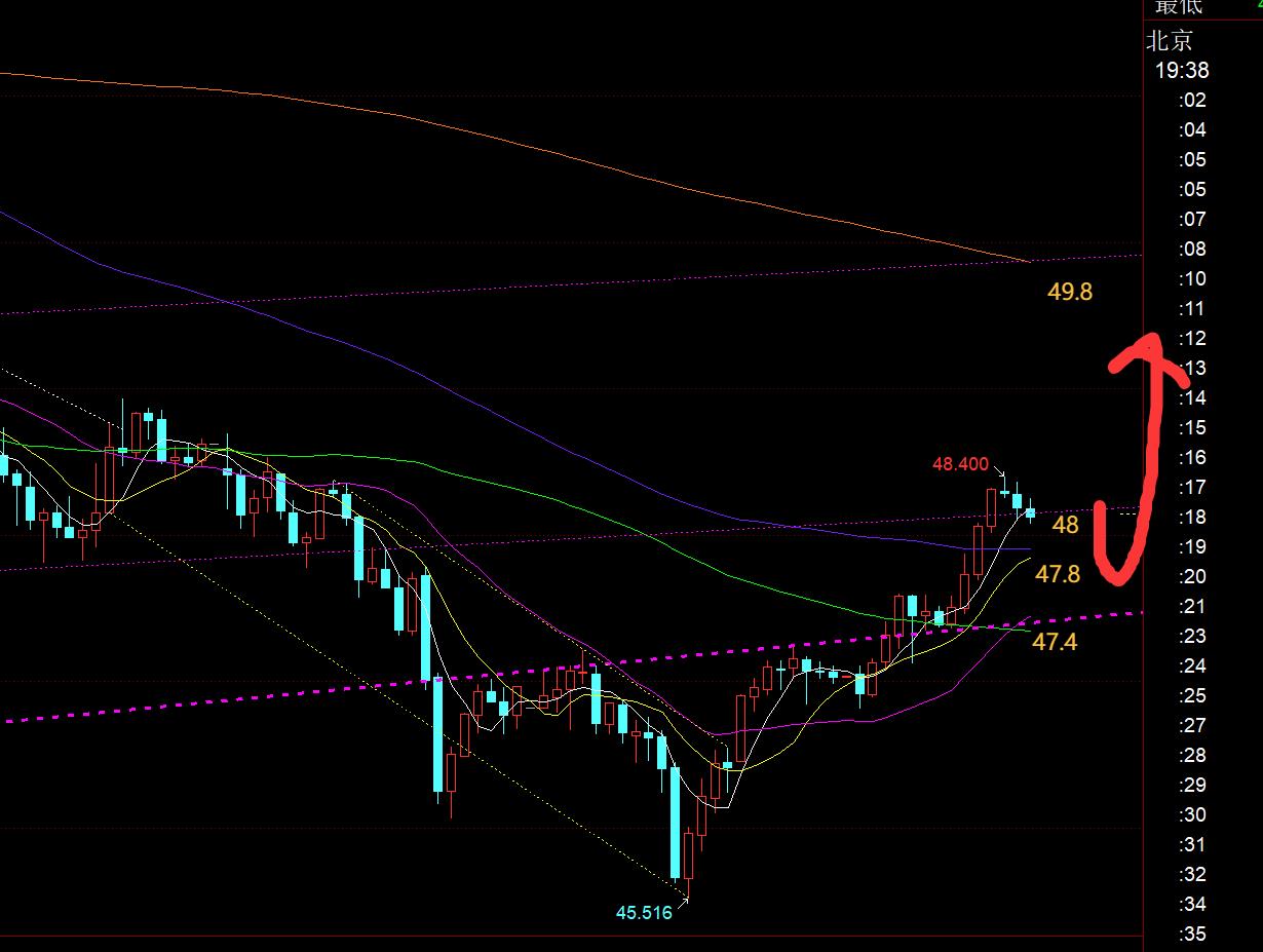白銀方面:白銀的表現比黃金強,日線今日已經有所衝破5均線,圖中粗的一條紫色趨勢線已重新突破站上,那麼47.4作為重要的支撐節點,也是此時小時線中軌,只要這裡穩住不下,則會進一步的拉升;4小時大陽中軌突破站上,回踩確認的支撐是47.6,小時線10日支撐是47.8,當前徘徊於前期底部整理區間下軌48一線,因此,今晚留意支撐48-47.8-47.6,企穩繼續看漲,阻力目標48.4,再上破則留意日線10日和中軌49.3-49.4,乃至49.8等;