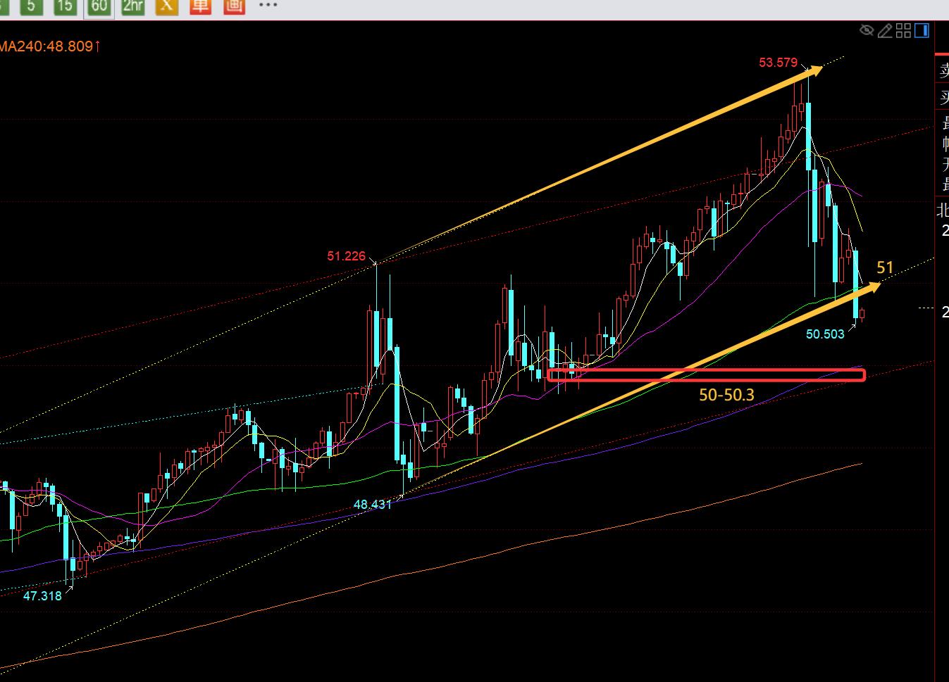 Deuxièmement, l'argent : le matin, il s'est appuyé sur le support horaire médian des 50 pour être haussier. Le prix a été légèrement pire de 0,1 et il est passé à 51,7 en une vague. Le marché européen est retombé à 50,5 et a continué à augmenter, et le prix était parfait. Sur place, le marché américain a continué de croître, atteignant la ligne 52,4 aussi haut que possible, ce qui est également très fort ;