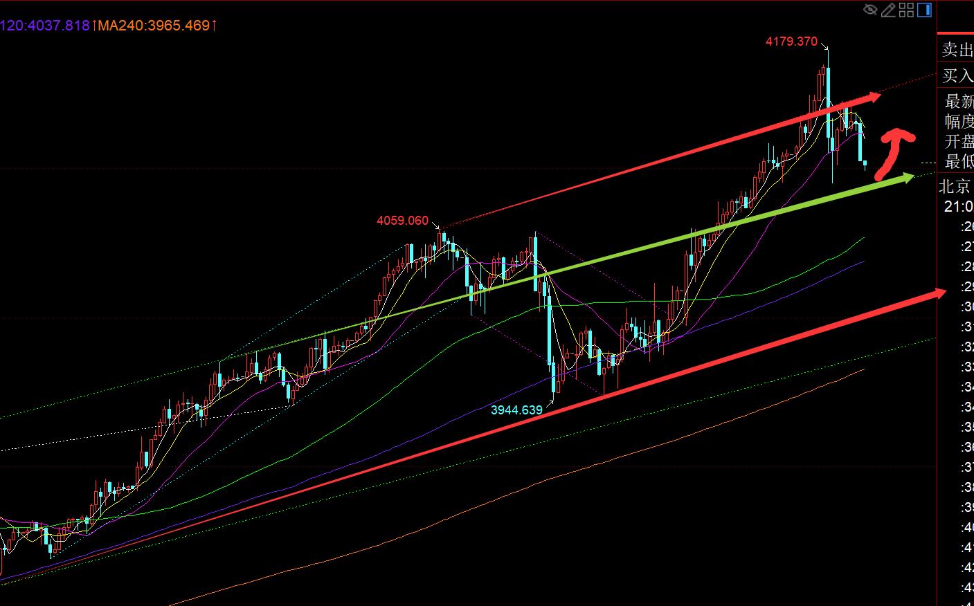 Premièrement, le niveau quotidien doré : le mouvement est encore important aujourd'hui, il a d'abord remonté de 70 mètres le matin, a plongé de 90 mètres l'après-midi, le marché européen a reculé de 50 mètres et le marché américain a supprimé 40 mètres à ce moment-là, oscillant violemment vers le haut. et vers le bas, formant une longue ombre supérieure K à ce moment. S'il ne peut pas contre-attaquer ce soir, il le feraCela signifie que nous continuerons à baisser demain, à considérer la moyenne mobile à court terme de 5, ou à la percer, puis à chercher à nous stabiliser ; à partir du 22 septembre, il suit un cycle de tendance similaire. Lorsqu'un gros Yang franchit le niveau de pression latérale précédent, il est suivi de quatre jours de négociation de forte consolidation, puis continue d'avoir un gros Yang pour franchir le plus haut. Après quatre jours de consolidation supplémentaires, il y a un autre grand Yang, et il a traversé trois cycles. Le Dayang K d'hier était La quatrième fois qu'il apparaît, il pourrait également entrer dans un quatrième cycle ; par conséquent, après le grand K positif, le deuxième K continuera généralement à fermer le positif, et le troisième ou le quatrième K reculera pour confirmer que le support moyen mobile sur 5 jours est efficace, et le cinquième K continuera à être positif ; par conséquent, aujourd'hui, il est peu probable qu'il soit possible de tester directement le 5ème jour, et le cours de clôture devrait également être supérieur au cours d'ouverture de 4110,6 pour clôturer le K positif ;