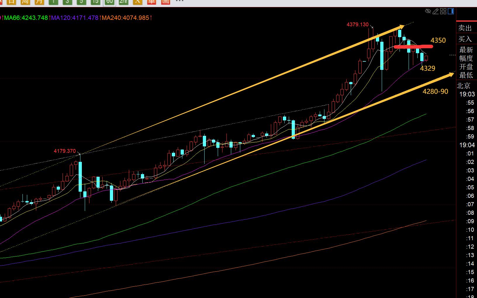 Troisièmement, le niveau horaire doré : d'après l'image ci-dessus, il est actuellement dans le canal ascendant jaune, et le rail supérieur a été mis sous pression à deux reprises au niveau de la ligne 4380. Il y a un certain double sommet, mais il doit tomber en dessous du plus bas de 4280 - 90 le matin pour former une suppression efficace de la tête M ; Cependant, le marché européen est dans une période de déclin continu des chocs Yin et Yang, et il y a trop de lignes négatives, ce qui suggère que l'énergie cinétique descendante s'accumule ; le support clé est la voie médiane, qui monte actuellement jusqu'à 4329. Une fois que le grand Yin ou le Yin continu aura effectivement rompu la position, il continuera essentiellement à faire baisser le marché ; s'il franchit le plus bas intrajournalier, il peut rapidement pointer vers le point de retracement précoce du canal de première ligne 4220 qui se trouve être la position de la moyenne mobile quotidienne de 5, puis observer si elle se stabilise. Si la ligne journalière est rétablie, les perspectives du marché peuvent alors continuer à rechercher les creux et suivre la tendance pour voir des hausses et des hausses ; si 4220 ne peut pas tenir, alors la tendance à la baisse est 4162 ; la résistance est claire, la position de pression du nœud est de 4350, qui est la position latérale du marché européen et le point de suppression de la moyenne mobile de 10. S'il perce à nouveau, il peut s'agir d'un lavage répété pour atteindre le plus haut intrajournalier. Vous devez également vous y préparer ; bref, attention à une vague de correction du marché ce soir ;