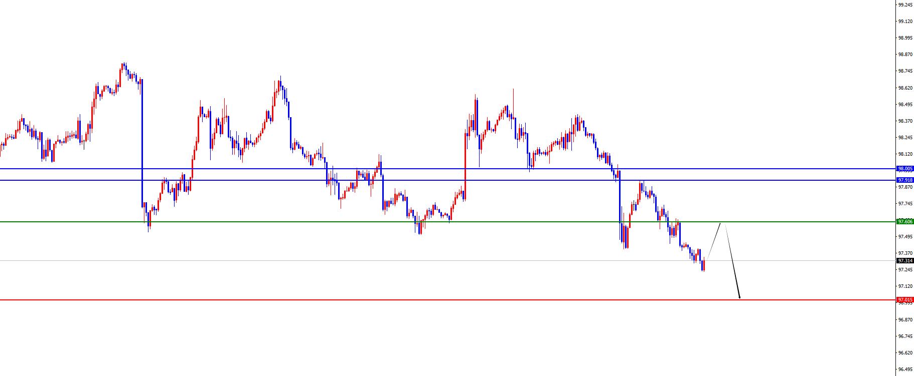 Da un'analisi multi-ciclo, il prezzo si è consolidato su e giù di recente a livello settimanale. Attualmente, la resistenza settimanale si trova nell'area 97,90 e il prezzo è a cortocircuiti al di sotto di questa posizione. Il prezzo passerà a lungo solo dopo la successiva chiusura settimanale sopra questa posizione. Dal livello giornaliero, con il passare del tempo, la linea giornaliera è attualmente affrontata nella resistenza nell'area 98 e il prezzo è attualmente ribassato al di sotto di questa posizione. Di recente, il prezzo si è consolidato su e giù in una posizione chiave nella linea giornaliera. In termini di operazione, è necessario prestare attenzione al ritmo di quattro ore. Dal punto di vista di quattro ore, l'attuale resistenza di quattro ore si trova nell'area 97.60. Il prezzo è breve in questa posizione. È breve prima che il prezzo sfumasse la resistenza di quattro ore. Se si rompe più tardi, deve girare in tempo. Al momento, viene temporaneamente trattato con il metodo di trading sul lato destro.