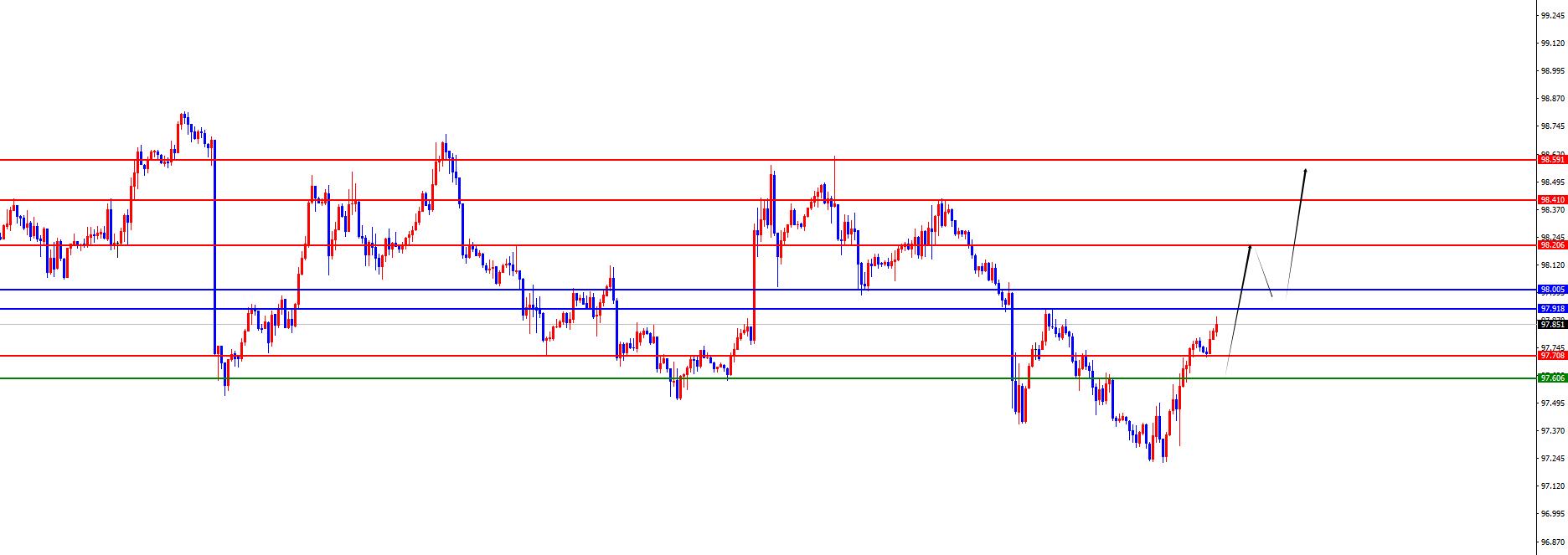 Da un'analisi multi-ciclo, il prezzo si è consolidato su e giù di recente a livello settimanale. Attualmente, la resistenza settimanale si trova nell'area 97,90 e il prezzo è a cortocircuiti al di sotto di questa posizione. Il prezzo passerà a lungo solo dopo la successiva chiusura settimanale sopra questa posizione. Dal livello giornaliero, con il passare del tempo, la linea giornaliera è attualmente affrontata nella resistenza nell'area 98 e il prezzo è attualmente ribassato al di sotto di questa posizione. Di recente, il prezzo si è consolidato su e giù in una posizione chiave nella linea giornaliera. In termini di operazione, è necessario prestare attenzione al ritmo di quattro ore. Dal punto di vista delle quattro ore, il prezzo di ieri ha sfondato la resistenza di quattro ore, quindi la resistenza a breve termine è diventata supporto. Attualmente, il supporto di quattro ore è supportato nell'area 97.60-70. In futuro, ci concentreremo sulle prestazioni di rottura della resistenza quotidiana e settimanale. Una volta che ci siamo sfogliati e sosteniamo fermi, possiamo continuare a guardare verso l'alto. A breve termine, ci concentreremo temporaneamente sull'area 98.20-98.40-98.60.