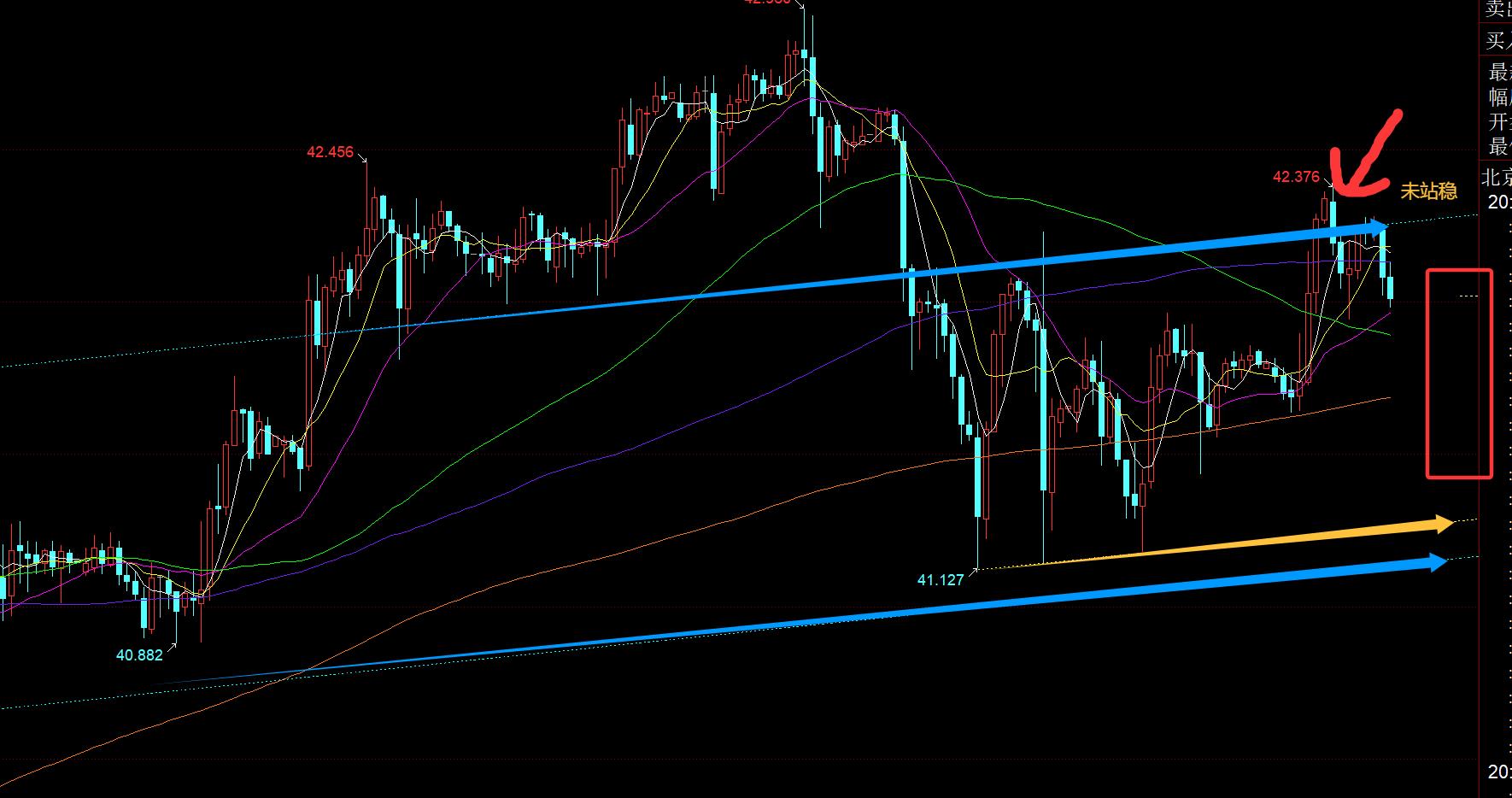 第二,白银方面:它的走势比黄金强,隔夜并未怎么下挫,保持通道内完美,41.1-42.2之间;昨日研报提及41.6-41.7小时线中轨支撑,最终稳定,今日拉升冲击42.35一线;