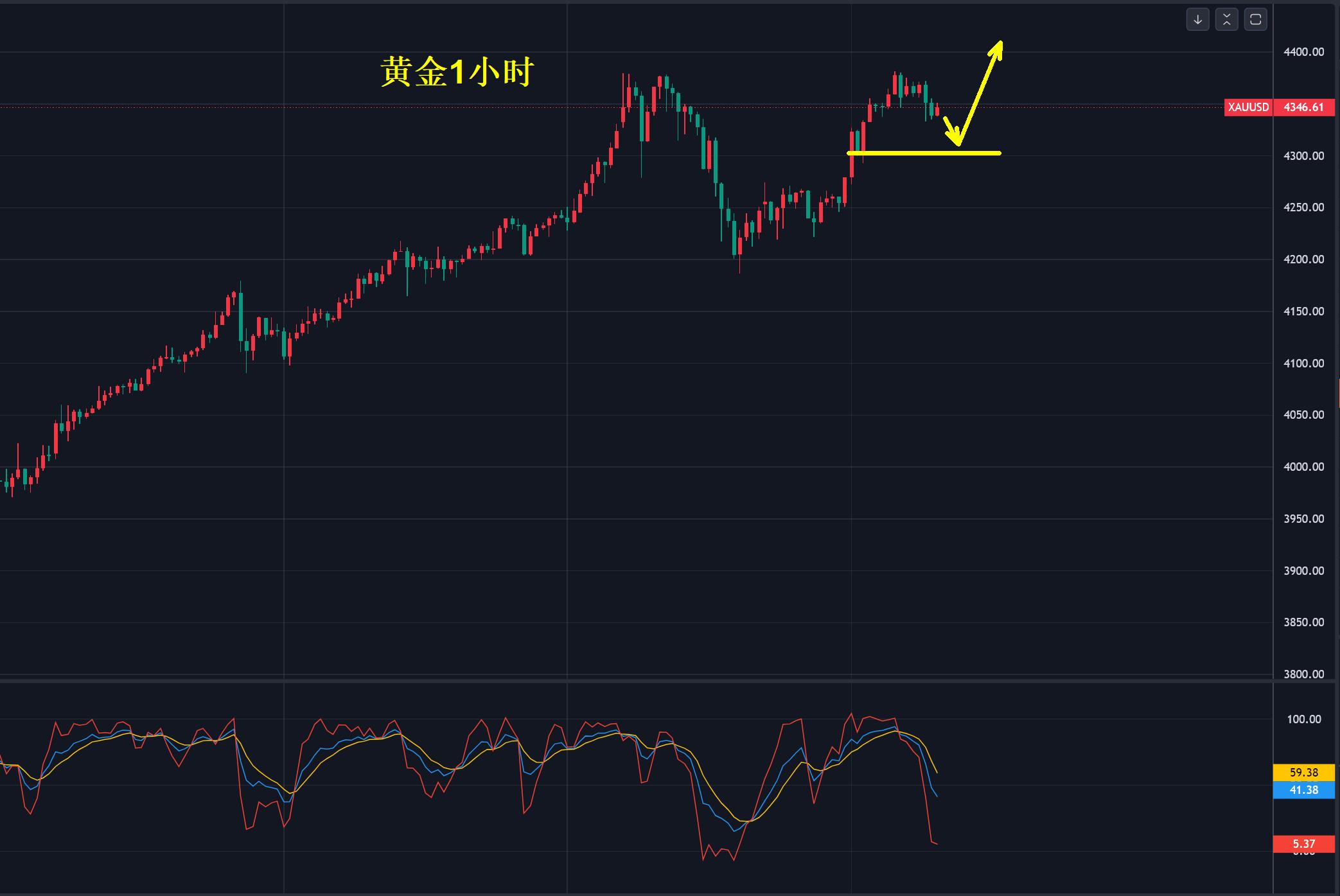 今天,前高点会不会破位?这里是形成双顶还是说继续破高?我认为回调后关键在凌晨支撑点4300美元/盎司,向上就看前高点4385美元的破位情况,这一波涨了1200美元了,也是此次上涨幅度最大的一次。