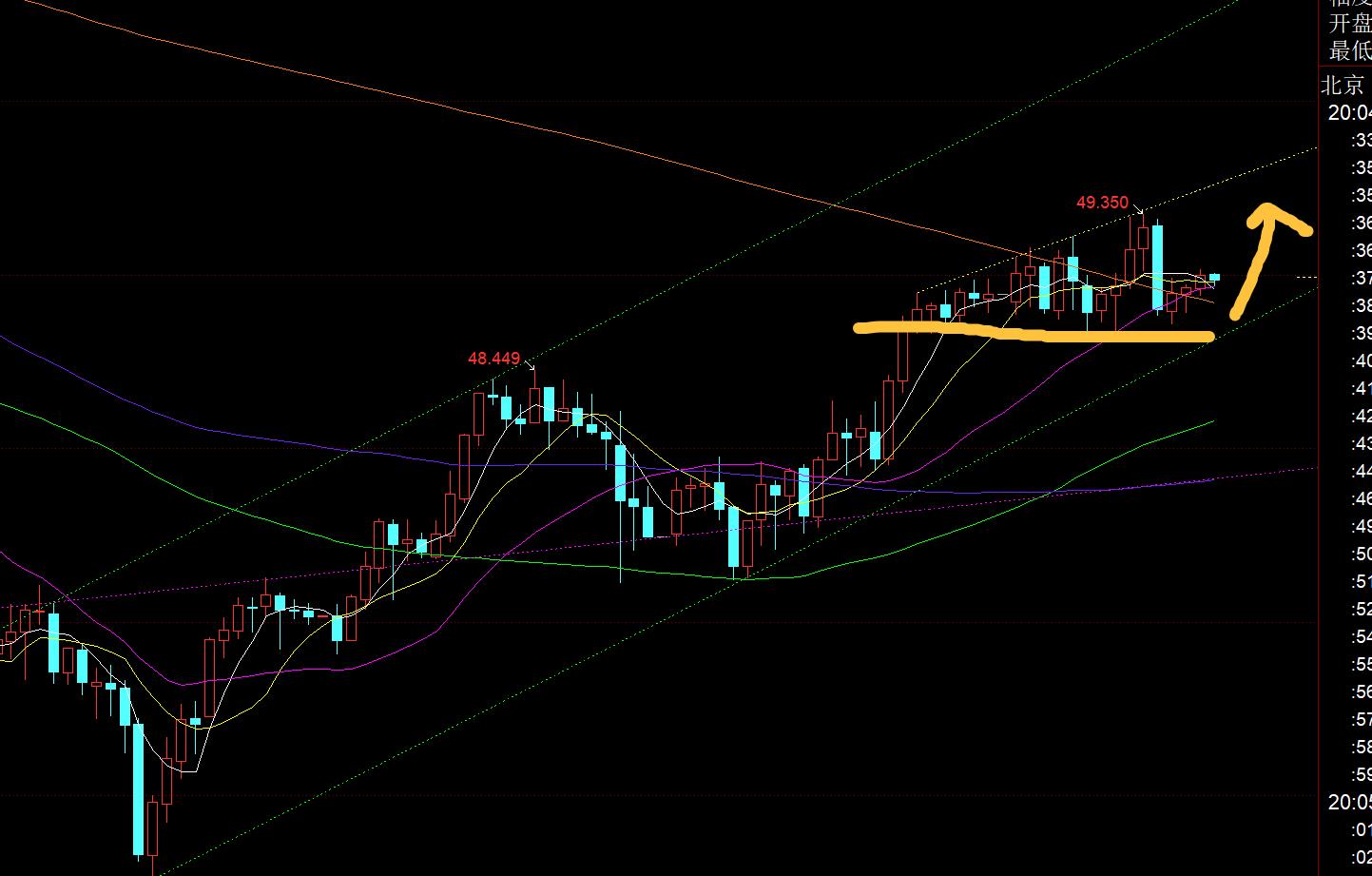 白银方面:日线也是大阳,已站上10均线48.6,测试中轨压力49.4;而日内处于高位持续横盘整理,48.65低点守住,则继续看好向上突破,一旦拿下49.4,上方空间就会逐步打开,次高点按618就会指向51一线;