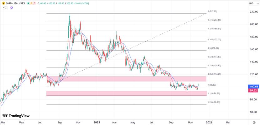 美团股价在今日获得追捧,跳空高开后早段一度升7%至10月底以来高位,如果业绩优于预期,且第四季度补贴压力放缓,平台逐步回归理性营运,则股价有望延续反弹,指向120港元的短线目标。但如果业绩令人失望,则关注继续下探新低位指向86港元的压力。