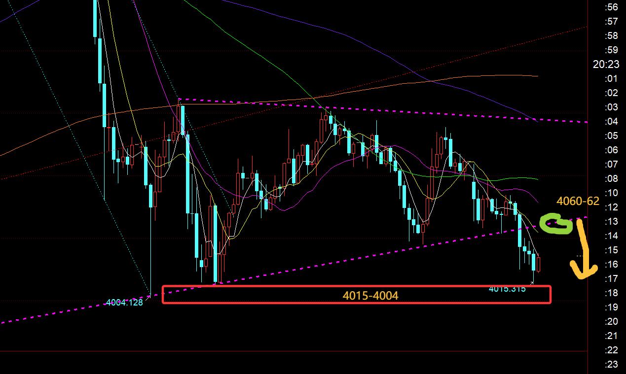 Quarto, o nível horário dourado: na imagem acima, o triângulo de convergência inferior quebrou continuamente durante o mercado europeu hoje. Depois, haverá uma recuperação antes e depois do mercado dos EUA, o que é fácil de atrair touros. Há uma segunda tendência descendente. Preste atenção ao ponto de contrapressão do canal 4060, que está sob pressão no curto prazo. Em baixa, o suporte inferior é 4015 e 4004. Se a marca de 4000 for perdida, preste atenção em 3975, 3945 e o limite é 3914. Pessoalmente, acho que o espaço inferior não é grande ou o tempo não é duradouro. Estará no fundo em 2 horas e 4 horas. Do estado, é fácil surpreender a recuperação do excesso de venda puxando para baixo; portanto, tente não perseguir o declínio antes que a recuperação esteja em vigor; Além disso, se o preço ultrapassar 4060 e subir novamente e regressar ao triângulo de convergência, ou expandirá o intervalo de convergência e continuará a consolidar-se, ou estabilizará lentamente e subirá. Você não pode ser cegamente pessimista; portanto, se você estiver em baixa pela segunda vez esta noite, o preço de fechamento não deve cair novamente no triângulo roxo do gráfico. Se quiser ser otimista em um nível baixo, você precisa esperar até que o segundo declínio seja concluído ou que haja sinais estáveis perto dos suportes mencionados antes de considerar;