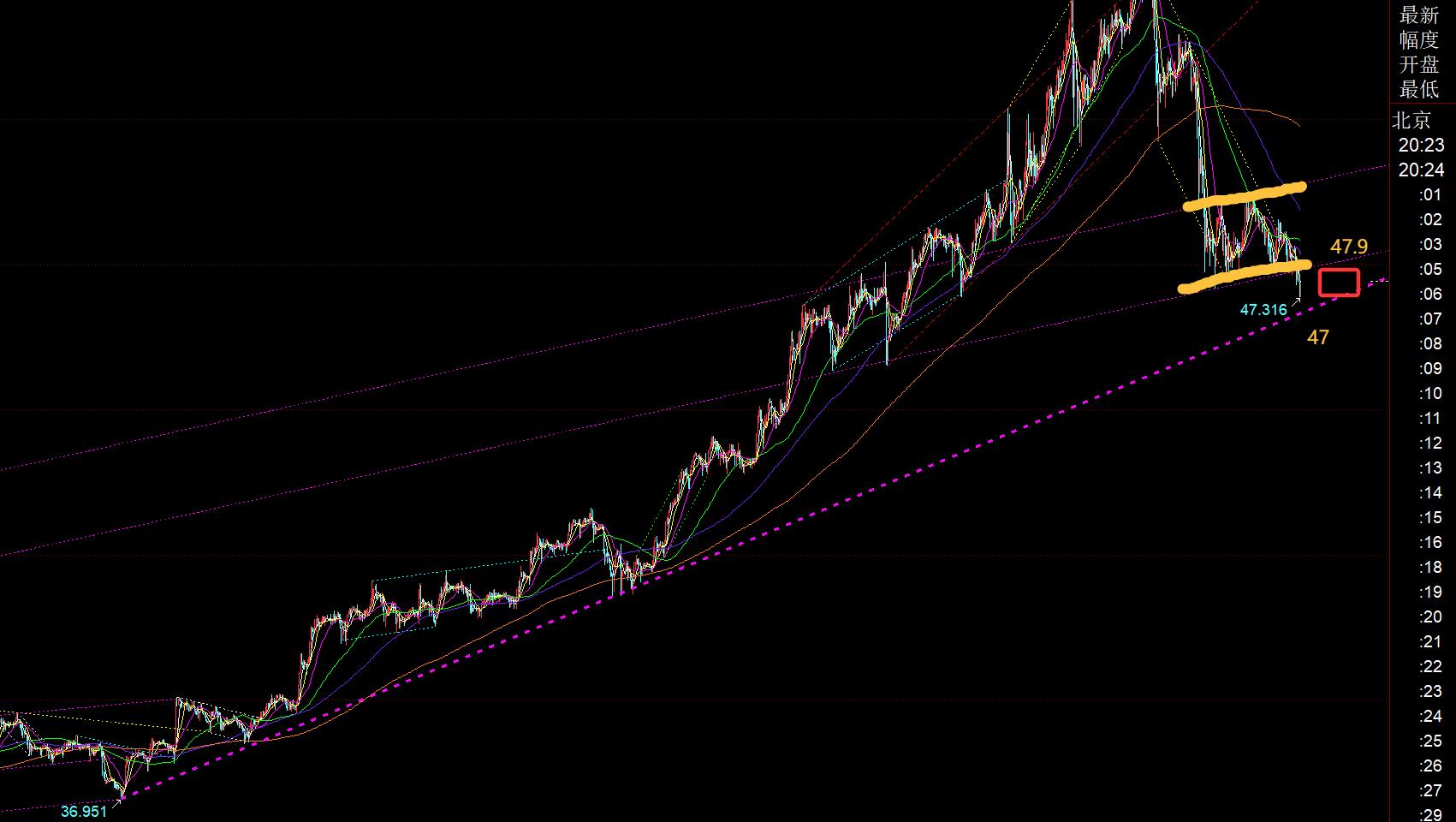 Prata: a julgar pela imagem, o mercado europeu também rompeu a faixa de consolidação inferior. A linha 47,9 é chamada de ponto de contrapressão. Se quiser cair pela segunda vez, não deve romper e ficar sobre ele. O suporte inferior é a linha de tendência roxa que é apoiada unilateralmente por 36,95. O ponto de apoio correspondente é a linha 47, que se estabiliza quando tocada. Então tente uma recuperação de alta; portanto, preste atenção à operação dentro da faixa de 47,9-47 e preste atenção aos ganhos e perdas;