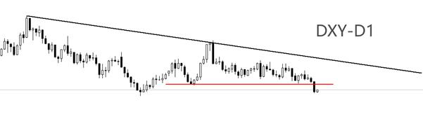 技術分析看,美元指數中長期維持空頭趨勢,本周有加速下跌跡象。昨日美元指數大跌0.73%,突破前期關鍵支撐位97.08點,最低達到96.52。下方沒有明顯的支撐區域,預計本輪下跌幅度較大。如果美聯儲利率決議結果符合預期,美指可能收出大實體陰k線。