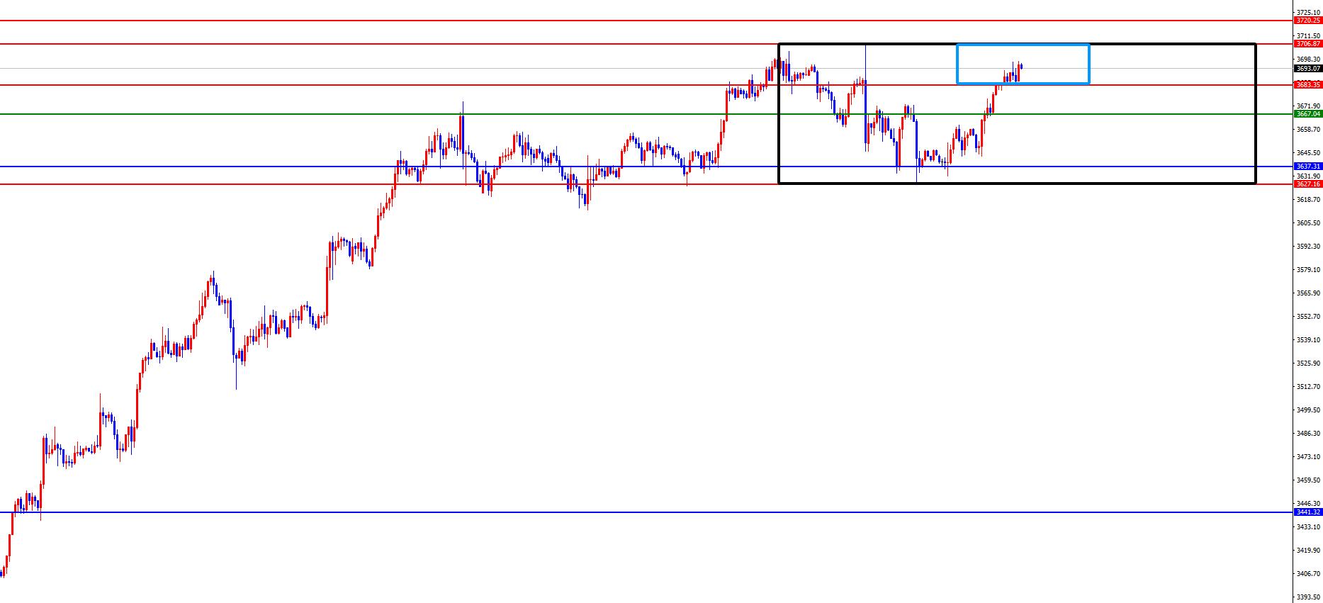 從多周期分析,首先觀察月線節奏,月線上價格8月份大陽收尾,整體看價格依舊多頭運行,從長線上看3000位置是長線走勢的分水嶺,價格在此位置之上長線多對待即可。從周線級別看,價格經過近期持續震盪後突破關鍵阻力,目前持續再創歷史新高位置,目前週線多空分水嶺於3441位置,價格在此位置之上中線多對待即可。從日線級別看,暫時需要關注3637區域支撐,此位置之上波段多對待。從四小時上看,上週五價格突破四小時阻力,則短線價格偏多,但是目前市場有在3627-3707區間震盪,所以在沒有突破前期歷史高位之前也要謹慎對待。下方3665位置為短期走勢分水嶺。一小時上價格目前多頭還沒有節奏,早盤低點成關鍵,所以目前短線先關注早盤低點及前期歷史高位區間得失,打破此小區間才會進行延續,所以目前多看少動,待價格打破小區間後進行看延續。