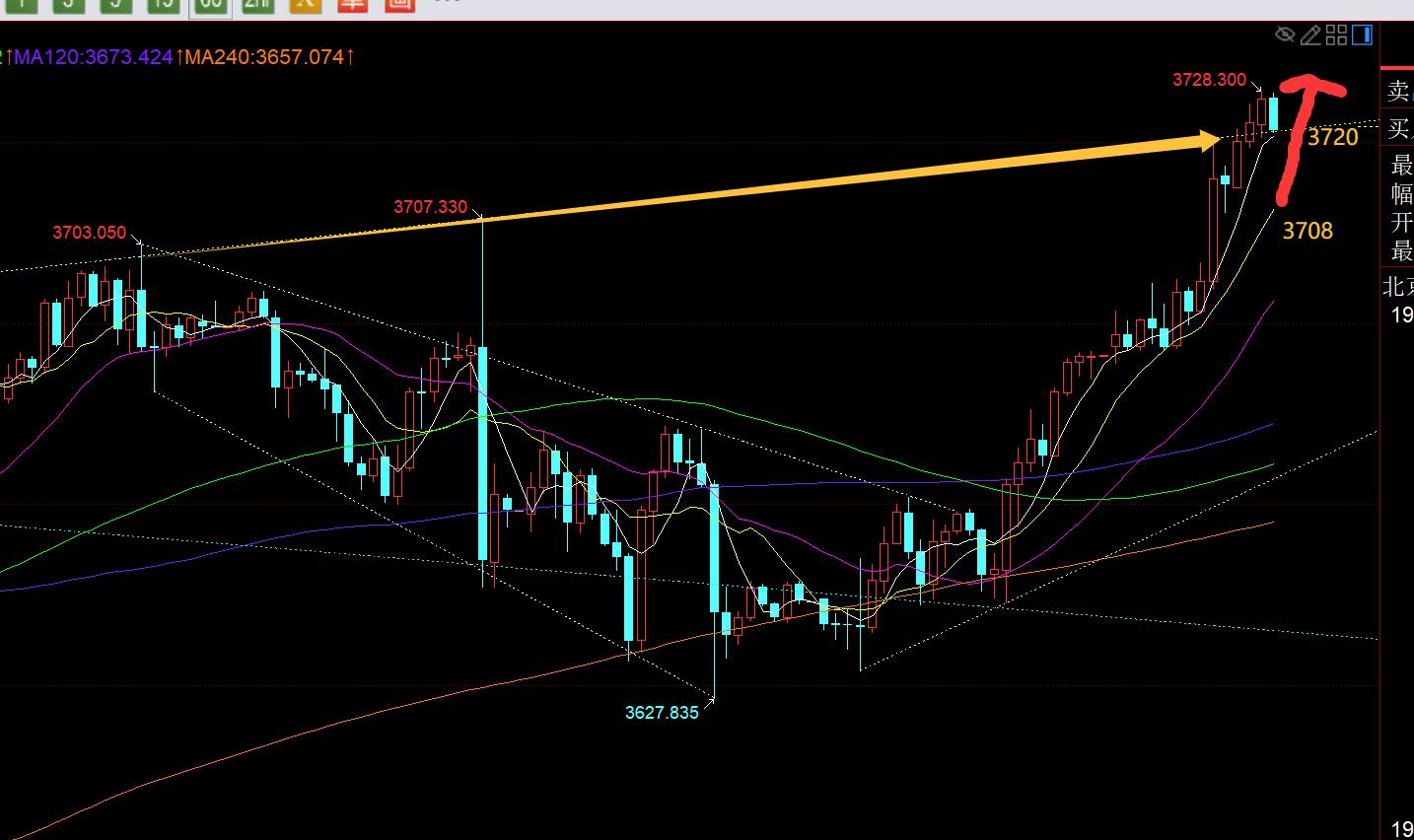 第一,黃金日線級別:對於週線和月線中長期的解讀思路可以查看周視頻;上週五收報飽滿大陽,今日勢必是繼續延續看漲,本還想著能依托5均線3672之上去跟隨看漲,再不濟早間3680凌晨低點支撐去強勢看續漲,結果都未給到機會;直接依托3685發力,亞歐盤持續單邊拉升,目前又形成了一根大陽,今日基本收陽問題不大,如果還是飽滿大陽,那麼明日還會繼續沖一下;預計國慶之前走勢會維持一輪單邊上漲,國慶前後謹防出現一波回調,國慶快結束前後再企穩繼續走單邊上拉,參考去年的走法;那麼本週衝擊3783其中一個長線目標就是大概率,預計靠近3800整數關口之下依舊會出現一輪修正,或緩慢震盪下跌或還是高位橫盤;從當前形態看,3707前高都已具備頂底支撐,日內只要拉低給機會,都可繼續順勢看漲,不要去猜頂,趨勢多頭下,頂都是用來突破的,並非壓制;只有大消息面改變,技術上才可能逐步出現所謂的頂,但至少是明年再說;