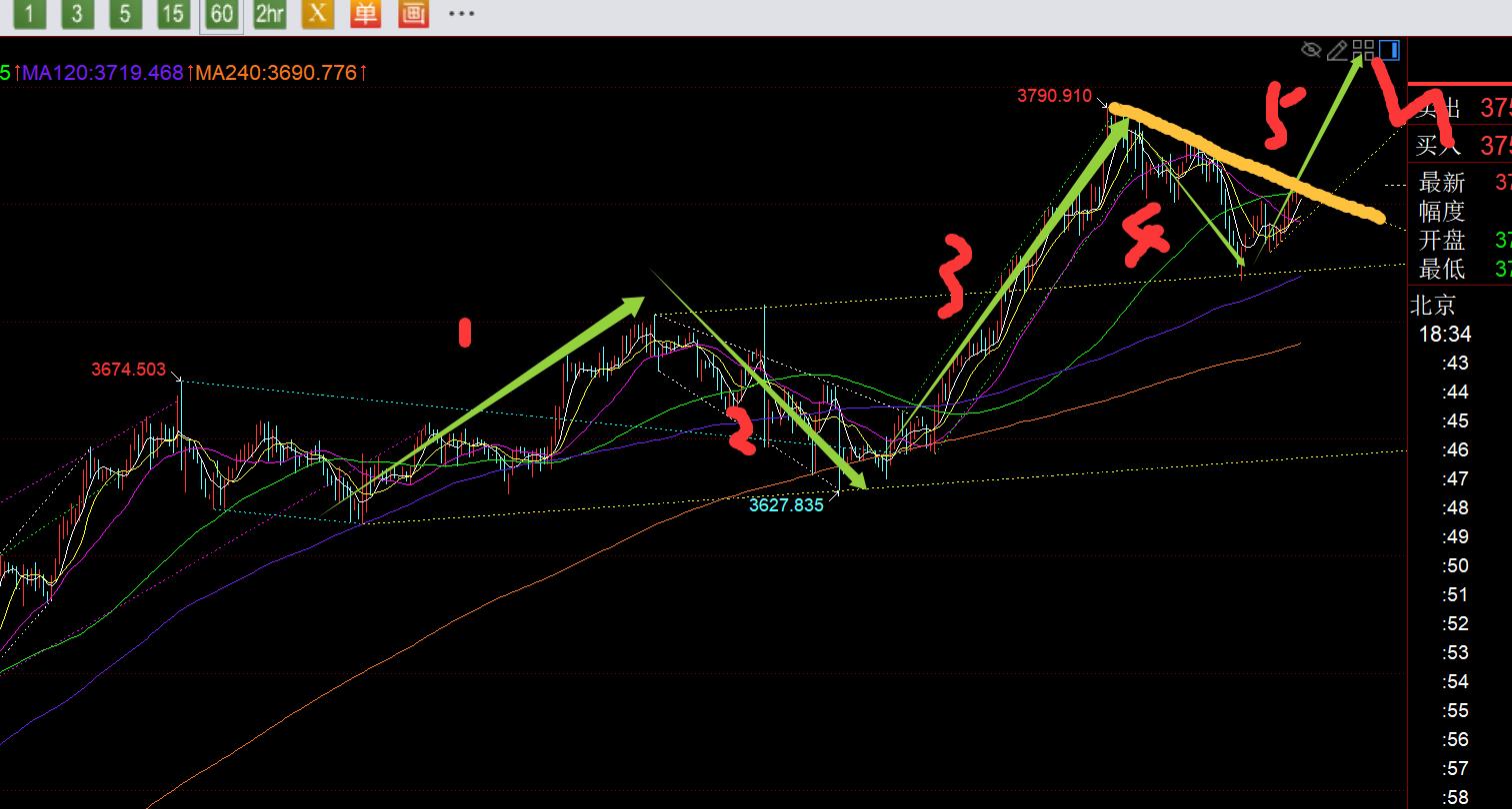 第三,黃金小時線級別:今日早間就給出上圖,根據近期走勢結合浪形推算,當前正在進行的是這一波的第五浪上漲,高度計算下來是3825一線;原本隔夜下跌一波,今日早間先反彈,對於震盪走法,一早延續性是差的,期待能二次回踩確認隔夜低點3720進行雙底企穩去跟隨看漲一波,比如昨日早間的走法;但可惜市場不給這個機會,歐盤低點3730一線提前出現企穩,歐盤連陽拉升發力衝擊當前黃色趨勢阻力線,一旦突破站上此線,就會向上發力一波上沖;因此當前價格3757-58比較重要,能大陽或連陽站上它,就有望衝擊3780、3790,甚至直接突破3800關口;下方支撐3750,極限中軌3743,今晚要上拉,最好不能再跌破失守中軌,否則容易繼續壓制震盪;