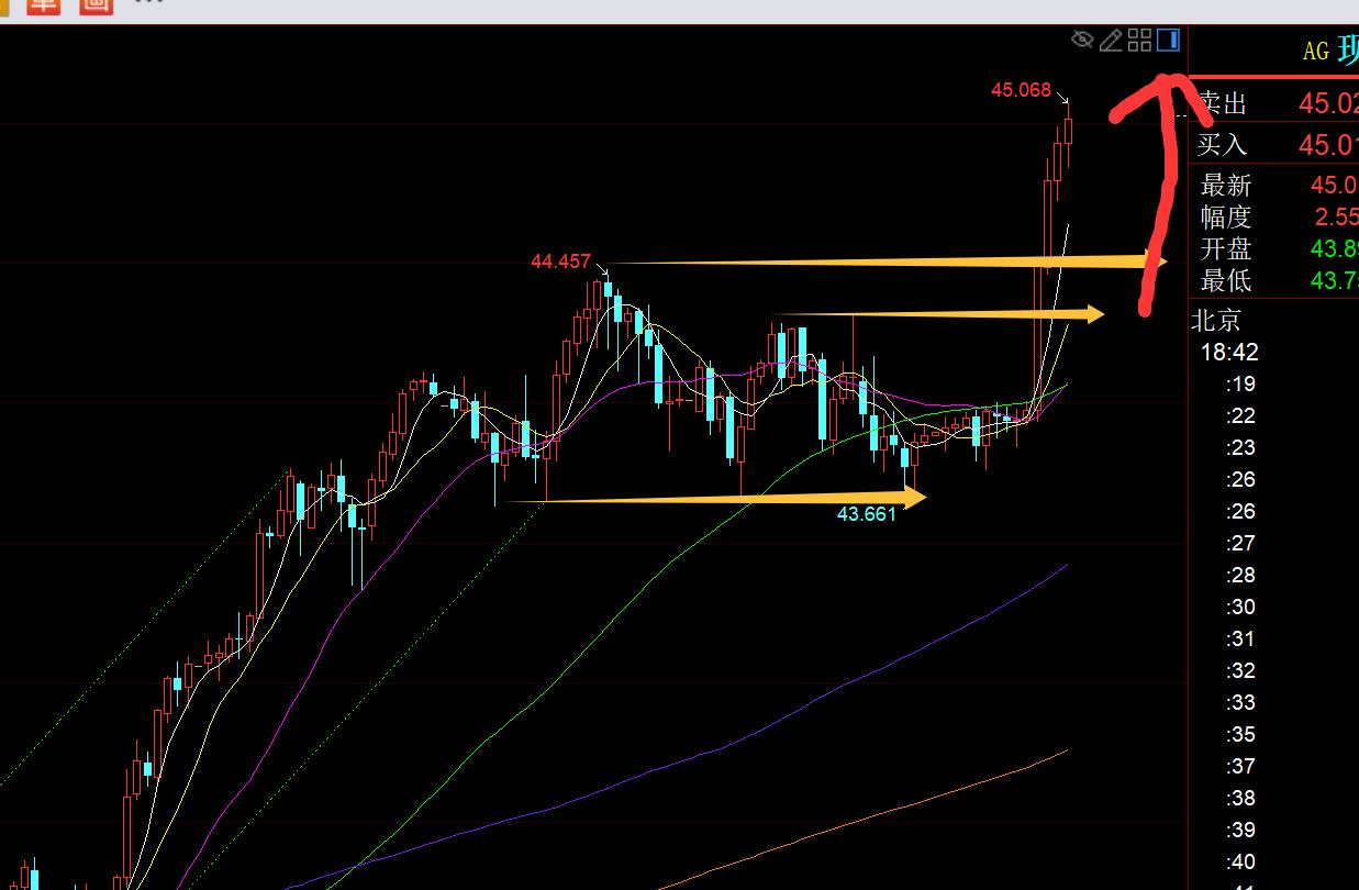 白銀方面:它比黃金已經提前強勢發力,再次刷近期新高,抵達45關口,非常給力;今年這輪白銀很有可能會迎來間隔15年以來的單邊狂拉補漲階段,加大了刷歷史前高49.7的概率;今日歐盤明顯連陽走強破高,今晚勢必是二次跟隨看漲;只要小時線出陰,就是跟隨看漲時機,44.3-44.45都成為頂底支撐,不一定能去試探確認它們,等出陰之後企穩就直接去跟隨看漲,阻力目標下一個45.5;