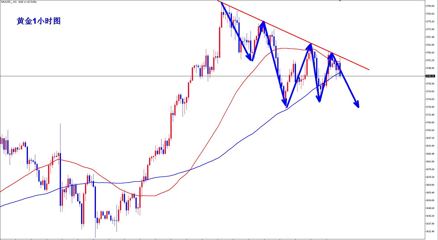 黃金1小時均線還是繼續向下拐頭,而且一旦形成向下的死叉,那麼黃金卡空頭可能將持續發力,黃金1小時雖然是震盪,不過整體已經開始震盪向下,黃金1小時每次反彈都是承壓向下趨勢線就開始下跌,現在下行趨勢壓制已經下移到3753附近,早盤反彈承壓3753繼續逢高空。