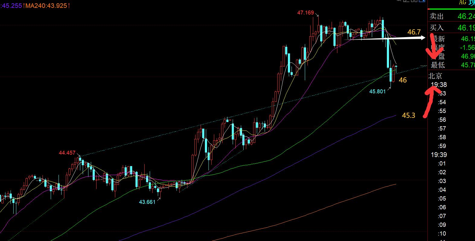 第二,白銀方面:昨日早間探底拉升,小時線收盤穩定於10均線,維持逼空拉升走法,則早間指出46.25上繼續看漲,成功抵達47關口收米;歐盤回踩依托頂底支撐46.6上企穩,繼續看漲,反复給到47目標收米;