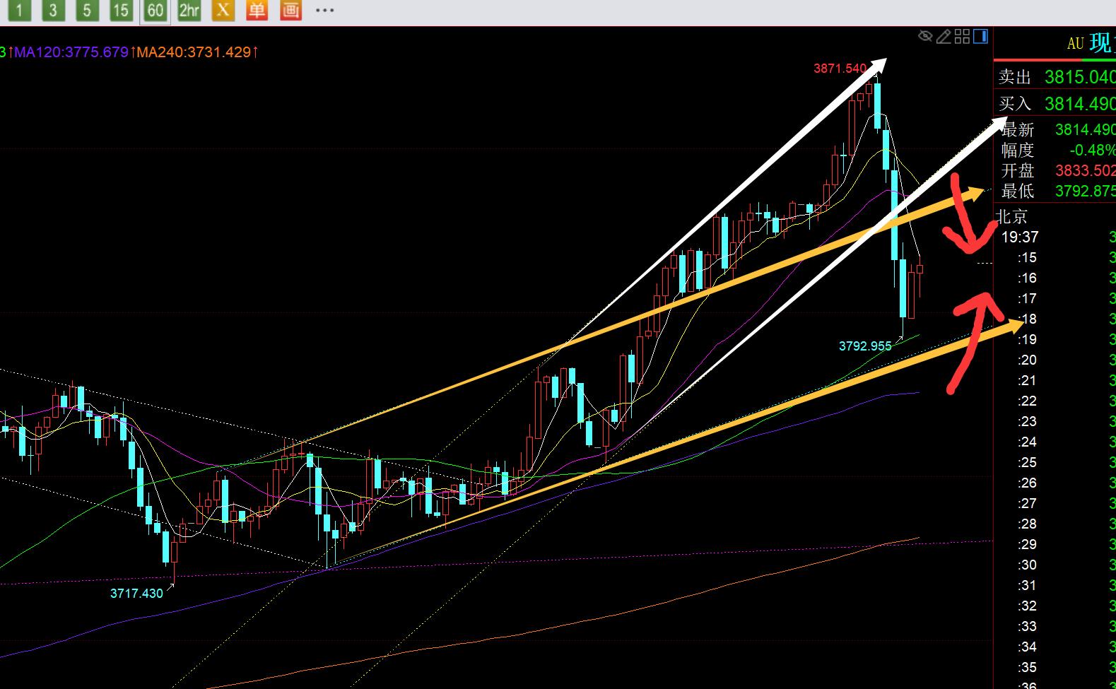 接下來,今晚預計震盪修復了,從高位打壓下來低位,已有80米,再往下空間也不會太大了,首要支撐是圖中黃色通道下軌位置,也是頂底點3790一線,其次是半年線支撐3776上,剛好對應日線5均線;阻力則是黃色通道的上軌反壓點3830-35一線,也是50分割阻力,還有就是3841一線,618分割阻力,白色通道的下軌反壓點(這個白色通道沒提前畫出來,日內高點剛好承壓其上軌);因此,就依托支撐和阻力之間做震盪修復對待,然後就看上下得失,若重新站上3830、3835,乃至3841,那麼短暫回調瞬間結束,回歸強勢拉升;若跌破3790,甚至3775向下,則下跌調整延續擴大;兩邊都沒失守前,就按區間震盪對待;