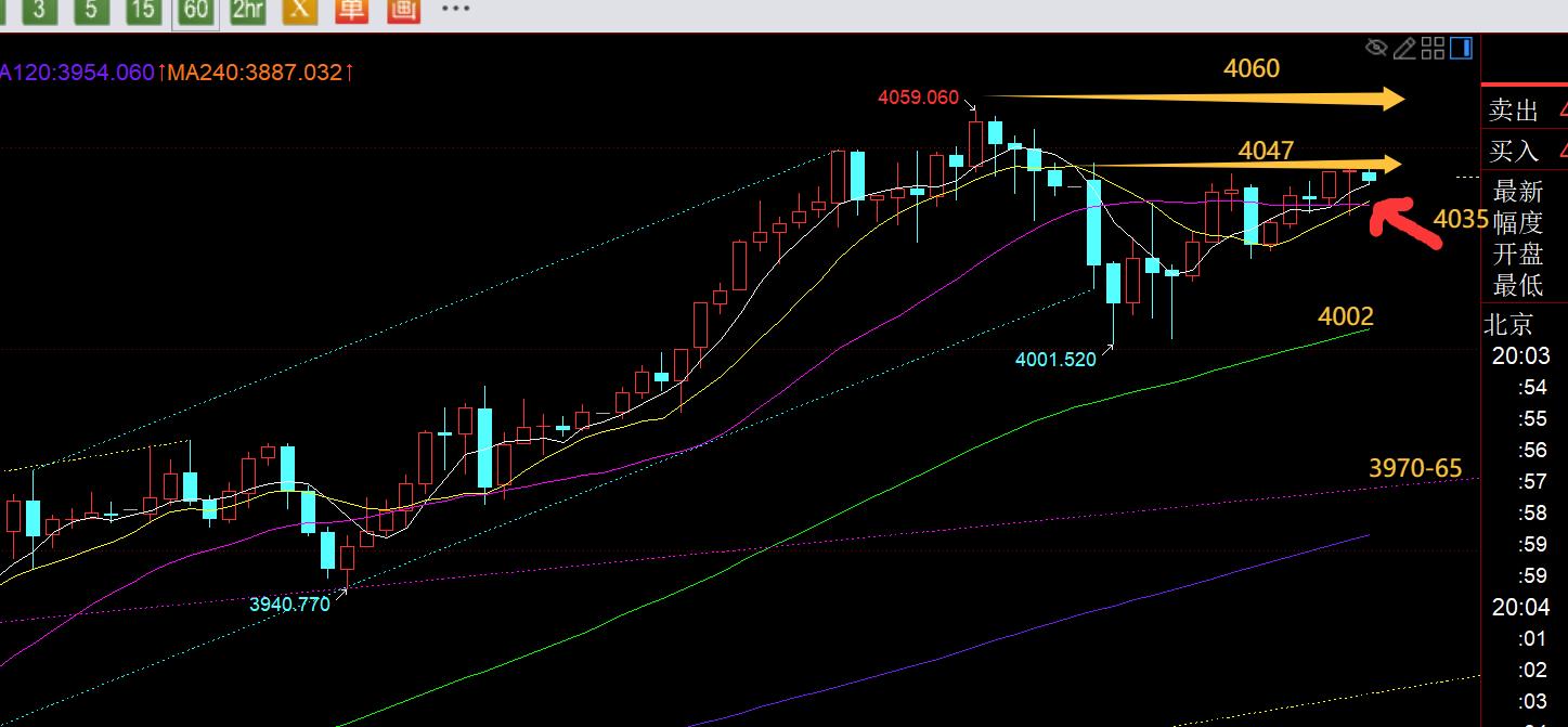 第二,黃金小時線級別:早間一根大陰急跌,失守10均線和中軌,則先反彈確認中軌,剛好也是隔夜高點跌至早間低點反彈的618分割阻力4037一線,跟隨一波看回調,最低觸及4002,有30米的利潤空間;那麼一波下跌之後,就逐步形成高點下移,低點下移的下滑通道,午後反彈通道上軌4028之下繼續嘗試看跌回落修正,但價格又突破了4037前面的開跌口,也就壓制失敗,通道形成失敗,就要重新規劃新的路線;整個歐盤其實都圍繞中軌在來回橫跳,延續性較差,一直處於看戲中;今晚留意10日均線4035,和昨晚一樣,只有它有效破位失守了,反彈確認之後,才能向下打壓一波,再去測試4000之上支撐,以及日線5均線3970上支撐;反之,4035一直堅守未有效破位,則走勢依舊保持相當抗跌強勢,上方就可能試探布林帶上軌3460一線看得失;