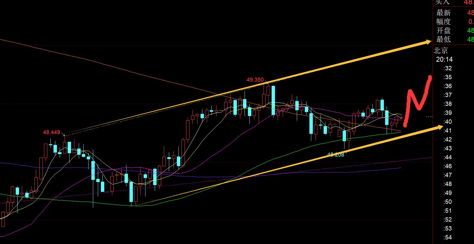 第二,白銀方面:對於白銀,日線級別是中軌壓制49.45,5日和10日共振支撐於48.2,所以也是震盪爭奪中;從上圖看,也有一個黃色上行通道,下軌支撐今晚留意48.5-48.6上,小時線中軌也有所突破,和黃金走法雷同,傾向於穩住中軌震盪上行反彈,然後再衝高回落,慢慢磨上行通道內;