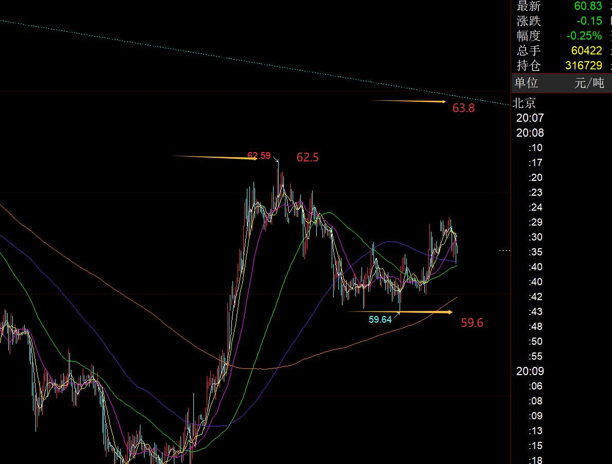 第三,原油方面:也是震盪,阻力62.5、63.8,支撐59.6,區間內運行對待;