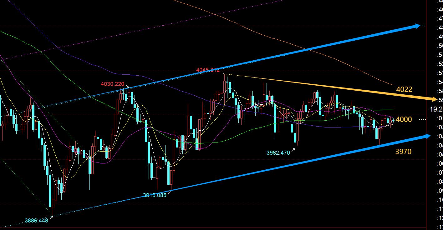第三,黃金小時線級別:今日早間又是循環先跌一波,11點出現探底長下影K跡象時,則提示3980可以先看一波反彈修復拉升,一早先跌或先拉,在震盪行情中,延續性是最差的,一般11點(冬令時)前後可以擇機把握一波反向,最終是成功抵達4000一線;午後壓制10均線再次承壓下挫,則提前埋伏上圖對應藍色通道下軌衍生支撐點3967企穩看漲反彈,最終剛好最低點打入,再次一波拉升抵達4000關口;今晚來講,中軌下移3997是一個中軸的關鍵,或4000一線是關鍵,一旦突破收盤站上,則回踩確認可以繼續延續看一波反彈拉升去試探黃色趨勢阻力點4020-22,此處若承壓不上再衝高回落;反之,中軌或4000下一直承壓不上,則還會反復下滑試探低位,屆時留意3674-70企穩反彈;另外,若向下有效破位藍色通道下軌,則要小心再走弱打壓一波,走下降旗形,屆時日線次高點的出現時間節點就要再延後等待;反之,若向上突破黃色趨勢阻力線,則有望逐步反彈去試探藍色通道上軌,那樣會加快日線出次高點的時間節點;