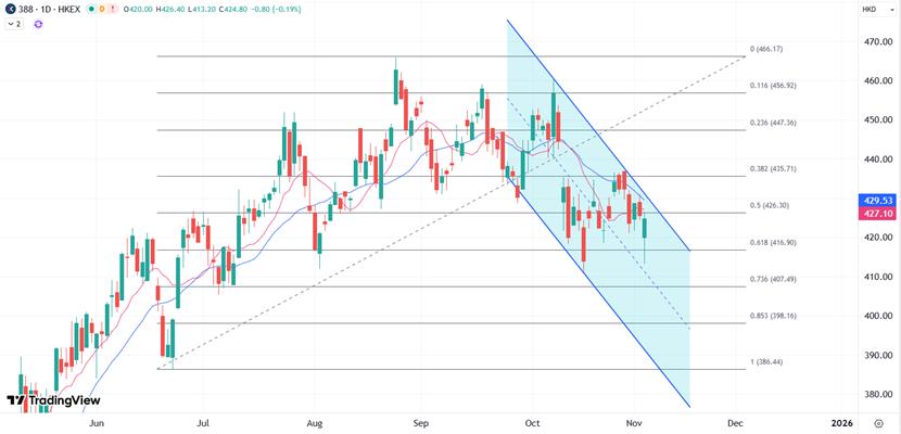 從估值看,當前港交所對應P/E約30-35倍,雖然接近一年高點,也高於歷史平均(約25-30倍),但低於高增長科技公司。業績超預期可能已推動股價近期上漲,但估值是否過高取決於未來增長可持續性。當前估值部分定價了交易量新高,但未完全反映IPO和衍生品的長期潛力。今日績後股價跟隨大市受到顯示,但短期股價會繼續消化業績利好,但能否帶動突破日圖均線阻力重回10月中旬以來區間的頂部,重返高位範圍的關鍵阻力在440港元。