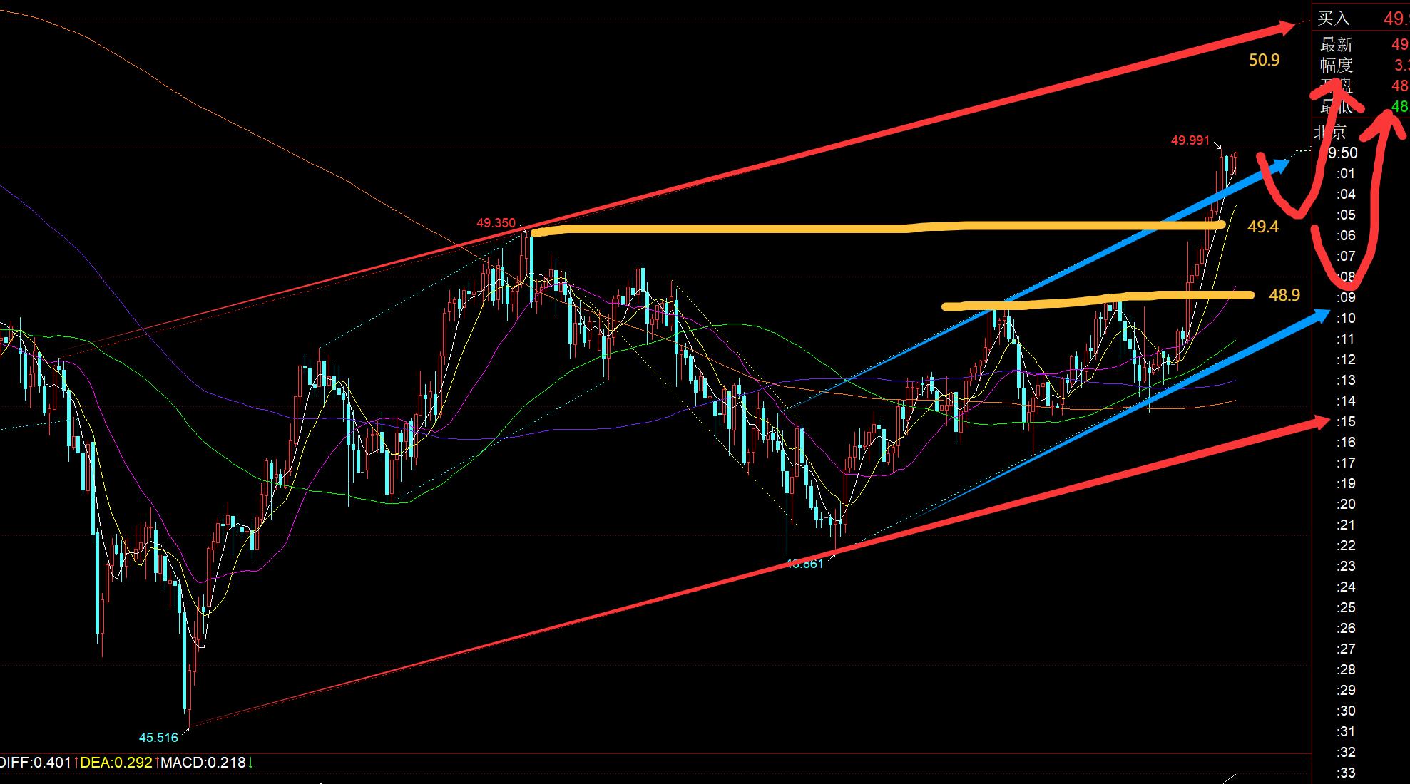 白銀方面:今日也是大幅拉升,目前是有所突破站上49.4關鍵阻力位,還需看今日收線來明確;只要日K收盤站上,那麼至少會產生次高點衝擊51一線,其次是52.5;當前從上圖通道看,49.65上支撐,若失守此處,則重點留意49.4頂底位置,和48.8-48.9,接近日內618,以及前兩日的頂底;拉低企穩繼續看漲為主,再往上沖擊的目標阻力是50.9-51;